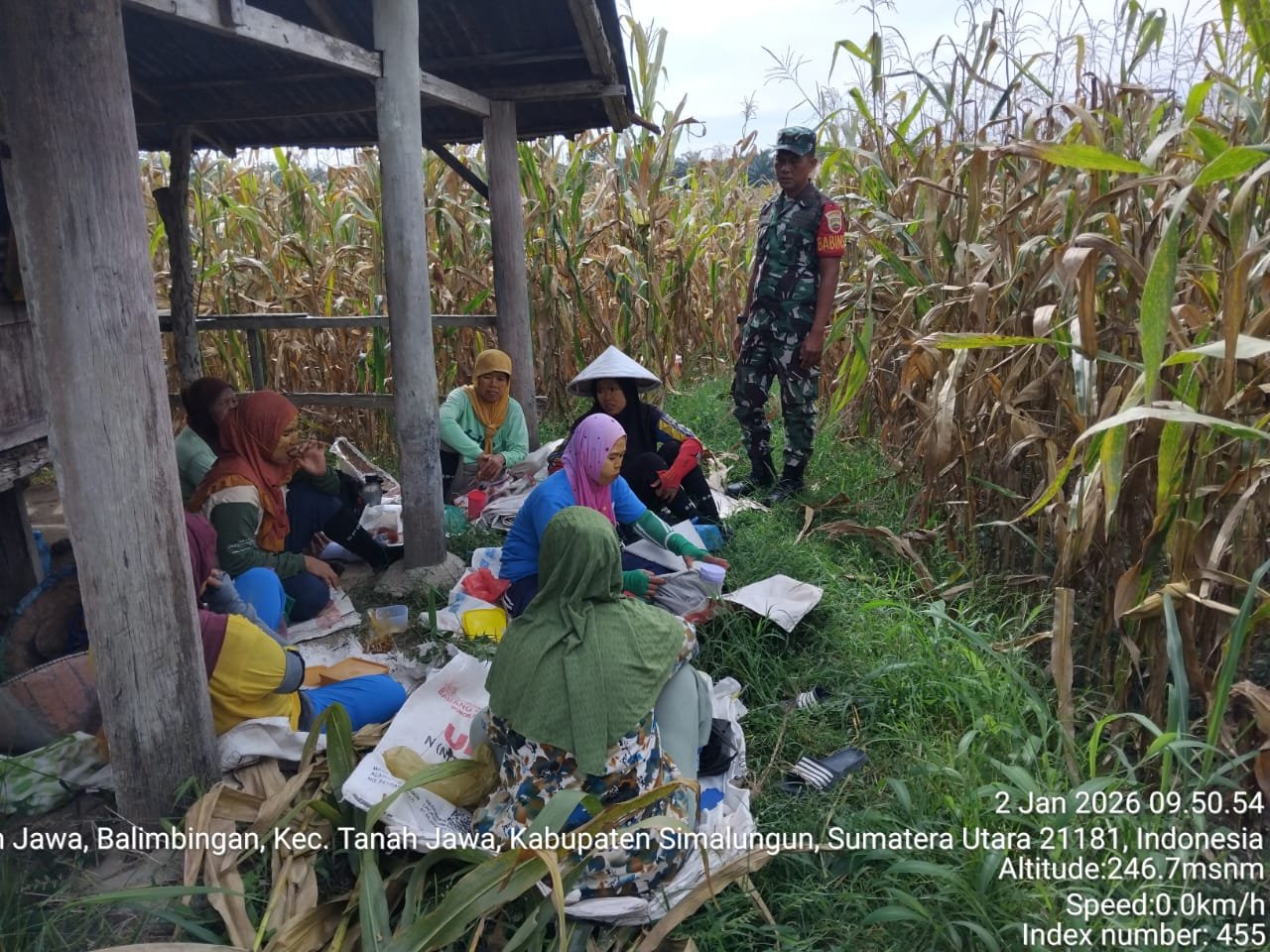 Dalam kegiatan tersebut, Serda H. Purba turut membantu Ibu Jaenah, salah satu petani setempat, saat melakukan panen jagung sekaligus meninjau langsung kualitas hasil panen. Kehadiran Babinsa di tengah aktivitas pertanian ini menjadi bentuk dukungan moril sekaligus motivasi bagi para petani agar tetap semangat dalam mengelola lahan pertanian mereka.